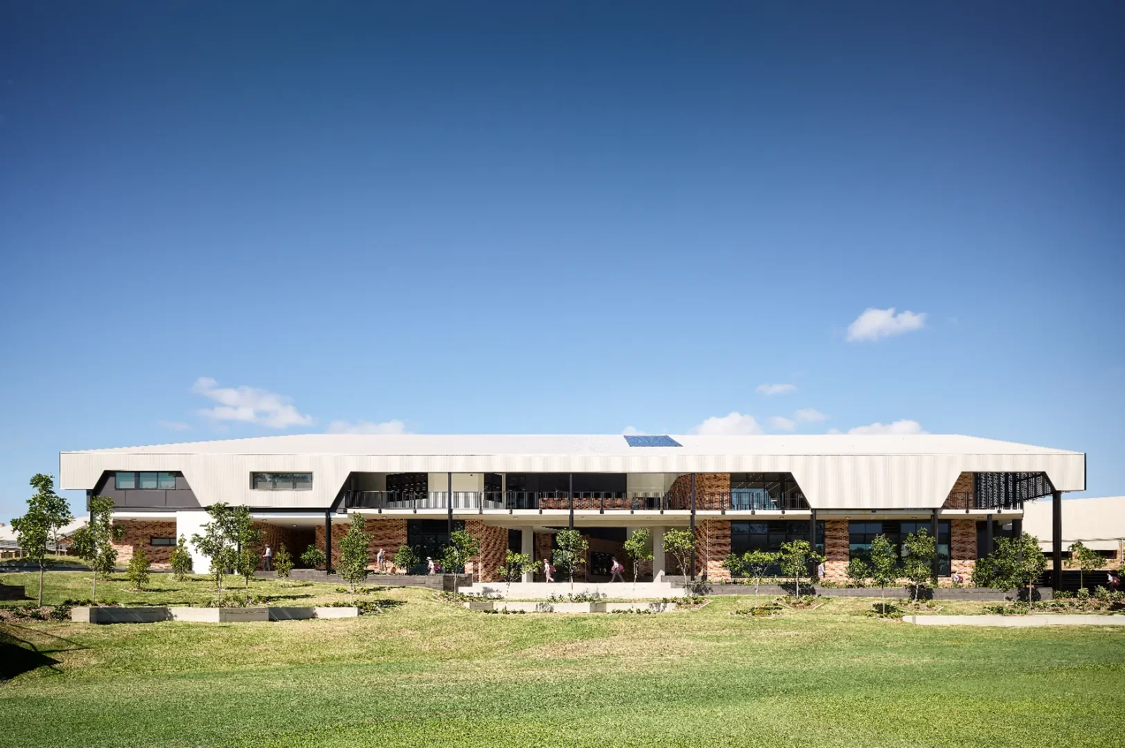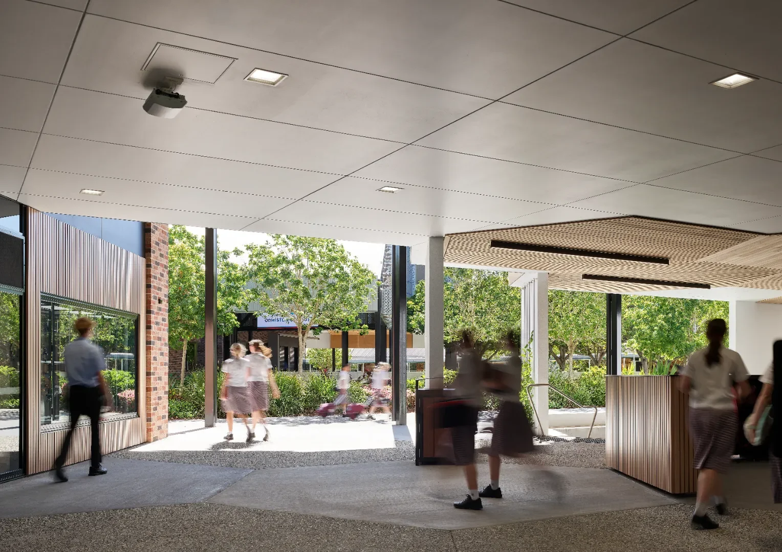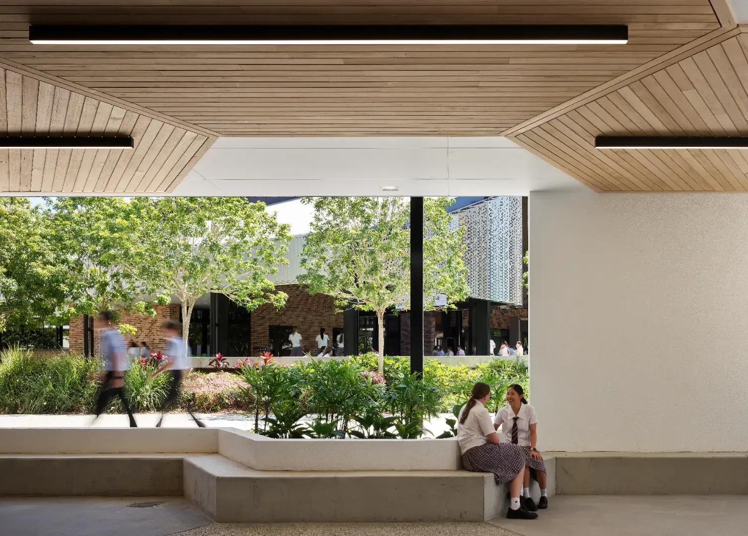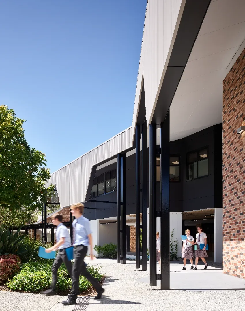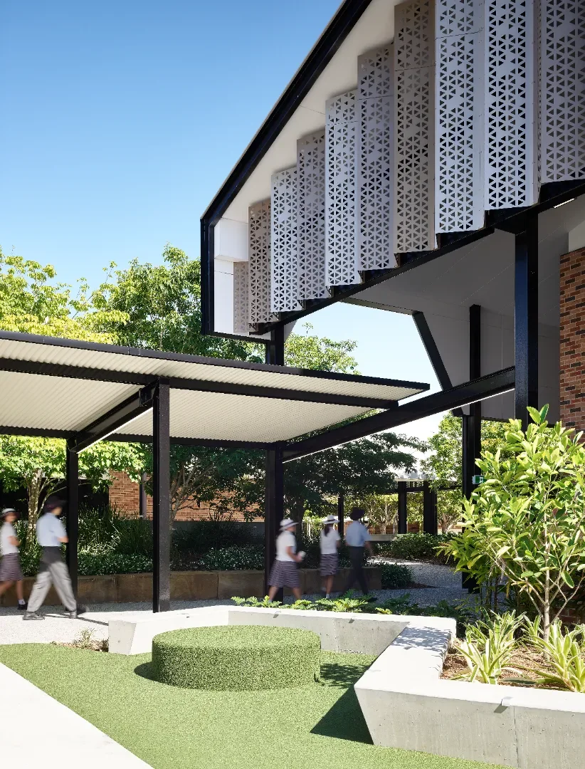 The building has an open ground level that provides year group seating and cross campus connections. Further landscaping and break out seating areas, gives more opportunities for gathering, play, and informal teaching. Vertical circulation nodes are placed within these cross-campus links and external verandahs, shield classrooms, all creating a building where the circulation spaces are open and passively designed, leaving only teaching areas fully enclosed and airconditioned.