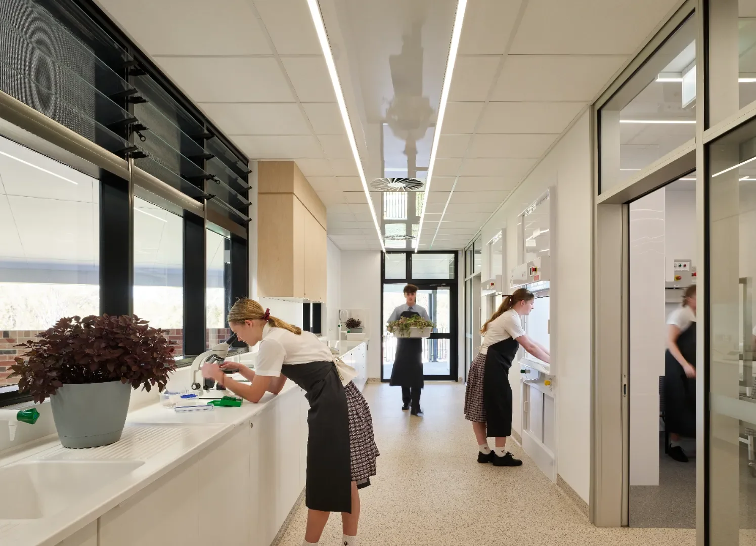 Tiered seating within the classroom to allow vision like an auditorium to the science experiments and immerse students in a learning environment. Room layouts were designed where student learning benches could double as experiment desks allowing multiple students to gather equally on all sides, enabling an efficient, considered practical learning environment. Open foyer areas on the ground level of the science building encourage visual and though traffic connections from this building to the broader school environment providing and encouraging students’ exposure to the science curriculum. All laboratories have expansive areas of glazing to encouraging this visual connection.