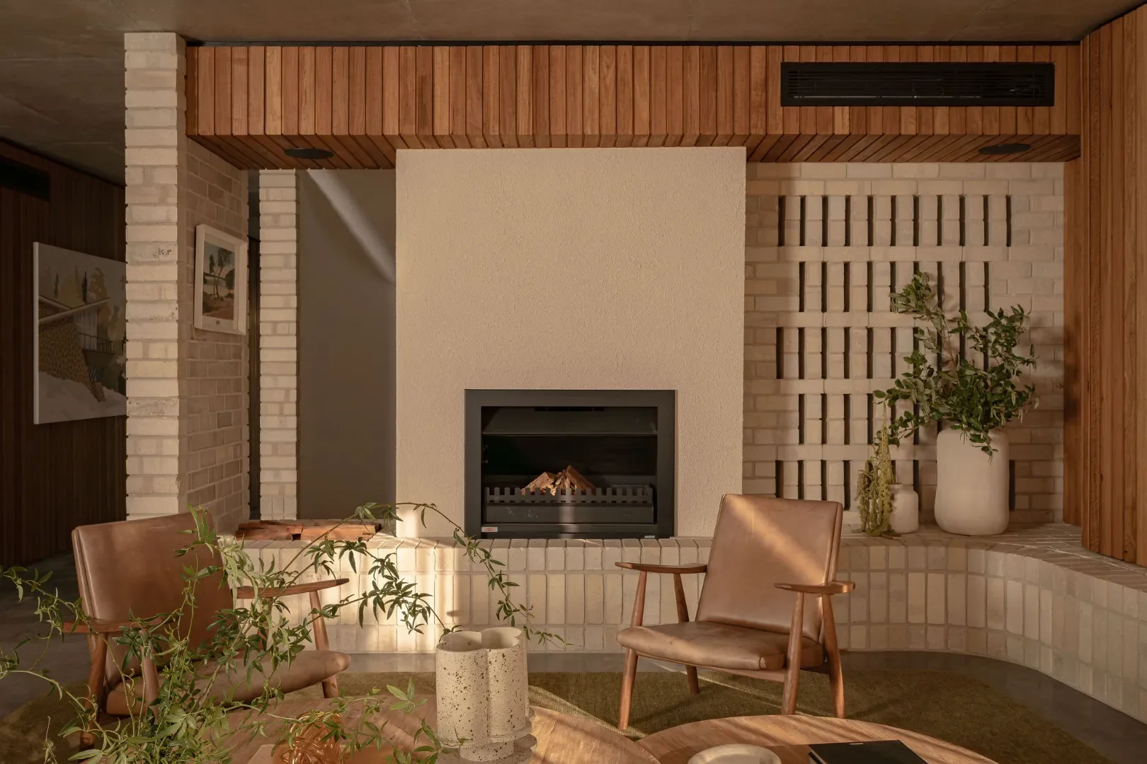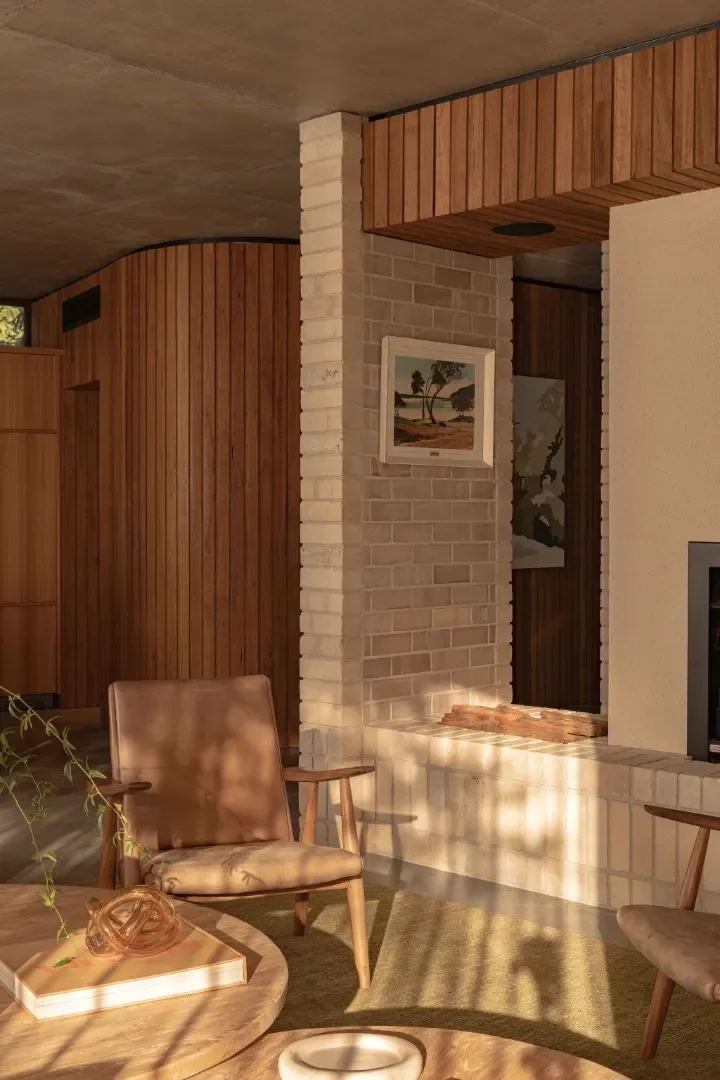 3-level curved stair • handmade brick screens • solid timber cladd internal walls • rooftop bar • heritage stone wall sky garden • stone walled cellar • old brick fireplaces & chimneys • blend of traditional vj cottage & new off form concrete structure •