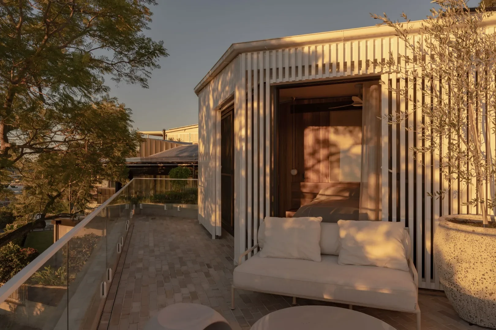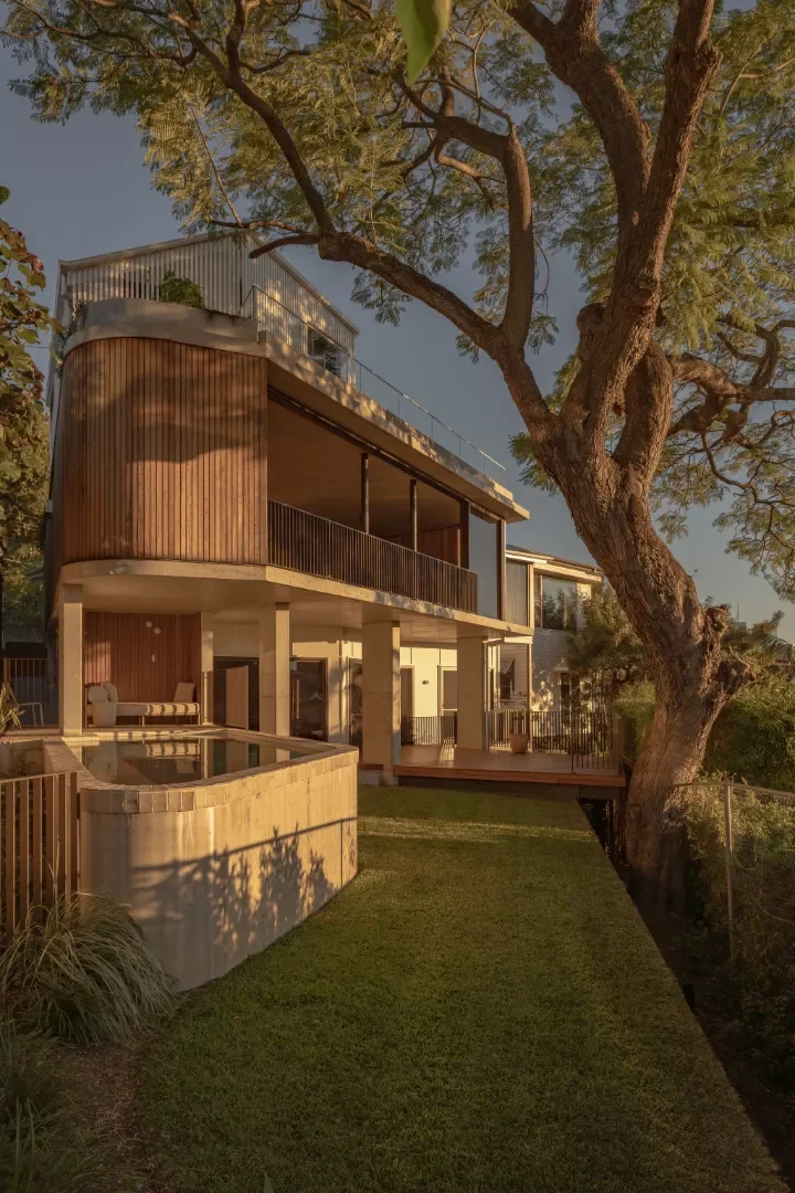 This renovated character house in Teneriffe, respects the heritage cottage whilst integrating a complimentary and contemporary extension. The jacaranda tree in the rear yard was a focal point for the house renovation. The tree branches become exquisitely framed by a panoramic window aperture spanning the entire rear of the new living, dining, kitchen area capturing its form and using its natural foliage as a living privacy veil. The myriads of interventions to the house over the 100 years of occupancy were stripped back to the intact remaining character elements , the main challenge to respectfully integrate a contemporary three level architectural home around a modest 1910 cottage.